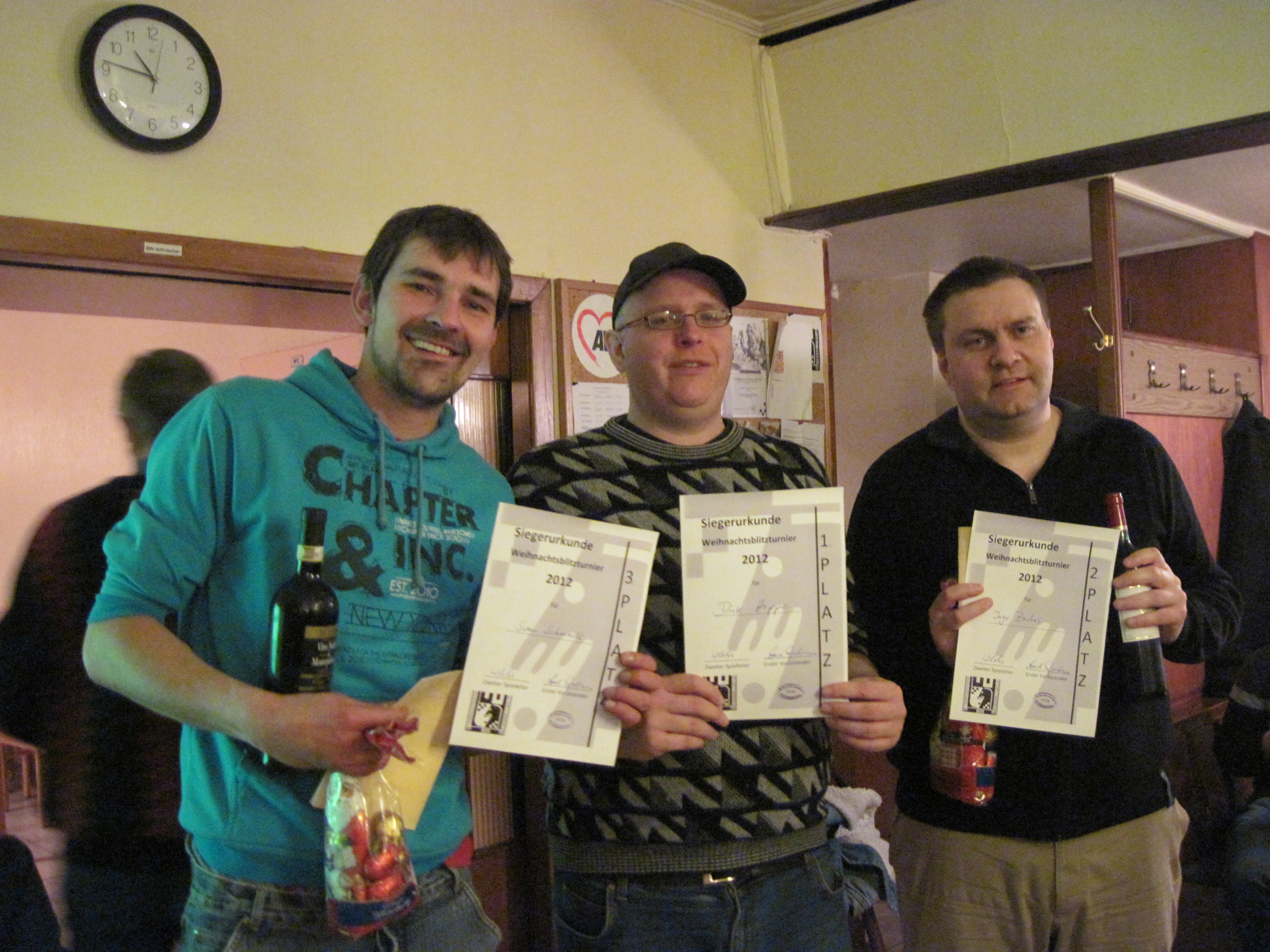 Unser offenes Winterspaß-Schnellschachturnier findet am Samstag,den 5. Januar, statt. Ab 11:00 Uhr wird bei einer Bedenkzeit von 30 min pro Partie die Sieger gleichstarker Gruppen ermittelt. Bei einem Startgeld von nur 3 € können sich auch "Pechvögel" über einen Preis freuen. Der genaue Spielmodus hängt von der Teilnehmerzahl ab. Voraussichtliches Ende gegen 16:00 Uhr. Wir freuen uns auf viele Schachfreunde und Gäste, die mit uns einen ruhigen und entspannten Einstieg ins schachliche Jahr 2013 begehen wollen. Fragen oder eine Voranmeldung bitte an 1.spielleiter[@]sveichlinghofen.de oder 2.spielleiter[@]sveichlinghofen.de richten (Ohne [] Klammern natürlich!).